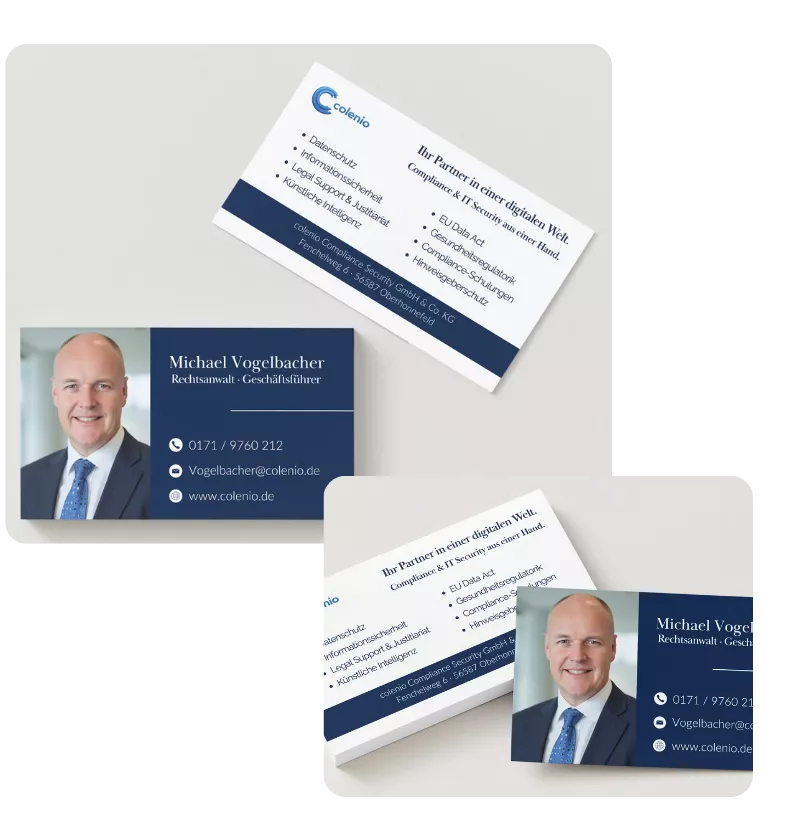Die Visitenkarten greifen das Design und die Klarheit der Website auf und sorgen für einen konsistenten ersten Eindruck im persönlichen Kontakt.