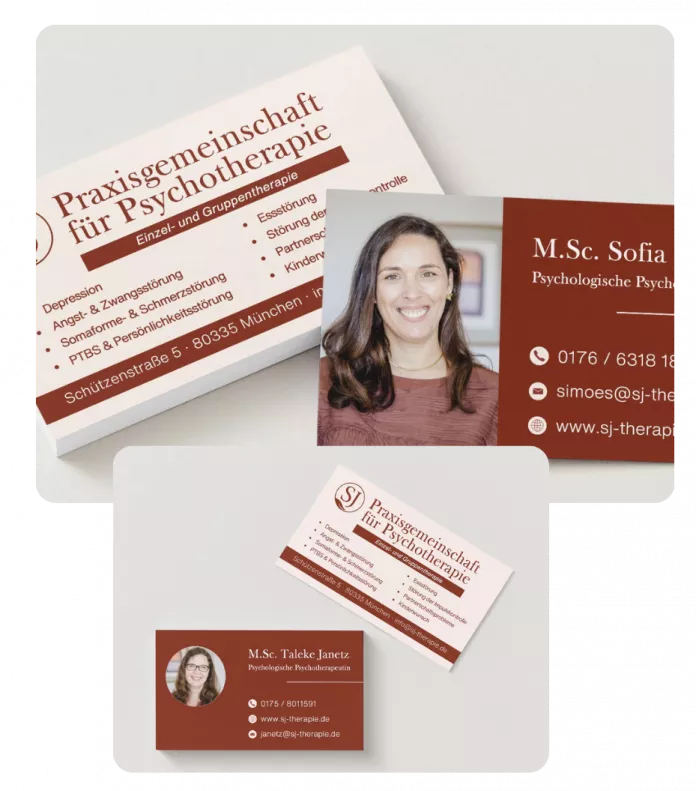 Die Karten greifen das zuvor definierte Farbkonzept auf und wirken durch die eingesetzten Porträtaufnahmen der Therapeutinnen direkt persönlich und nahbar.